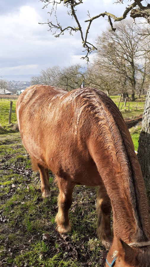 Par contre je l'ai attaché pour passer l'etrille car elle perd tellement de poils, c'est plus facile à ramasser. Et elle ne prend pas tout dans la figure, après je l'ai laissé brouter un peu et on est parties.