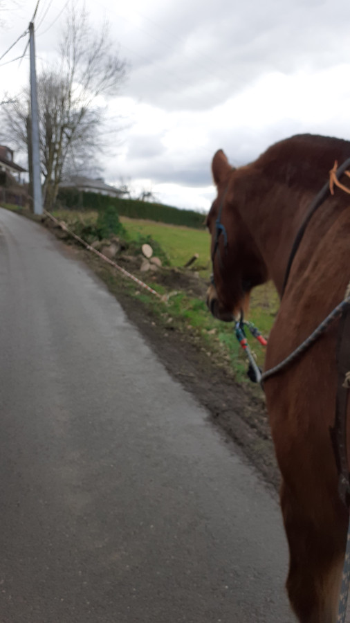 Petite sortie de détente post travail en carrière. De l'amélioration des stops depuis le pas et le trot en bosal, puis sorti avec pas mal de trot lent sur route.
