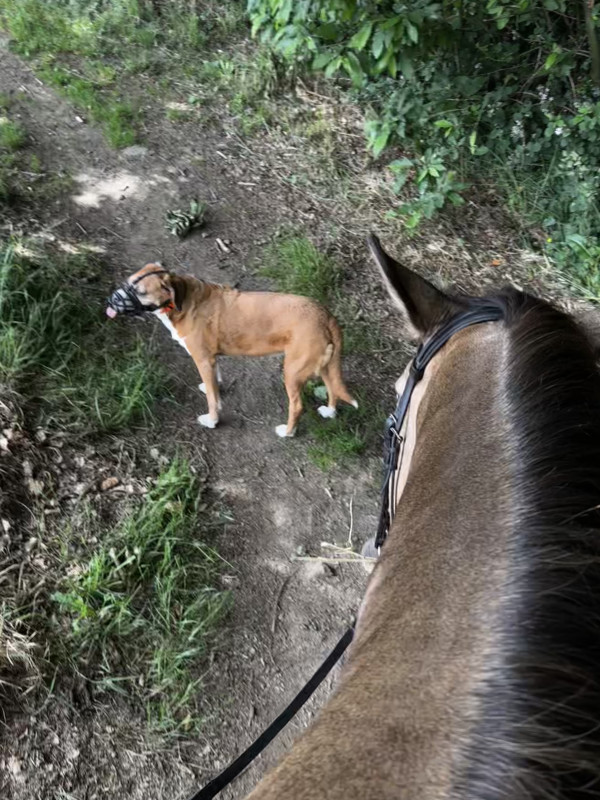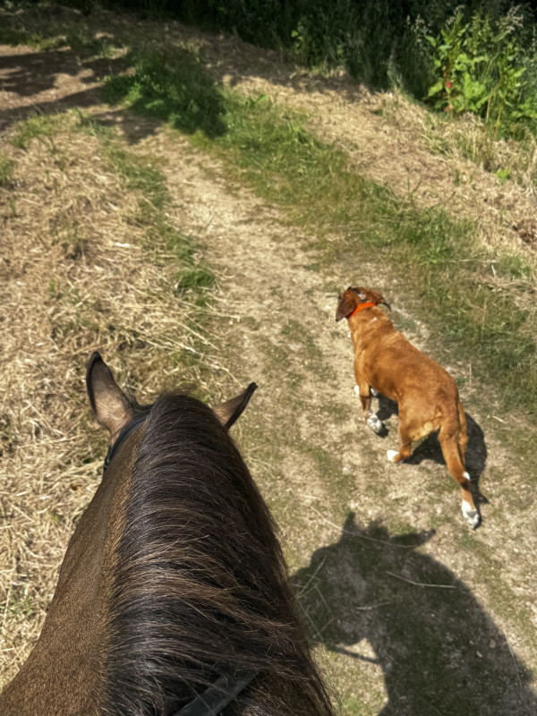 Ça se confirme, elle est vraiment plus sereine quand la chienne est avec elle. Tellement calme que pour la première fois j'ai osé sortir le téléphone en selle (je ne prenais pas de grand risque puisqu'on arrivait sur une montée bordée de châtaignés).