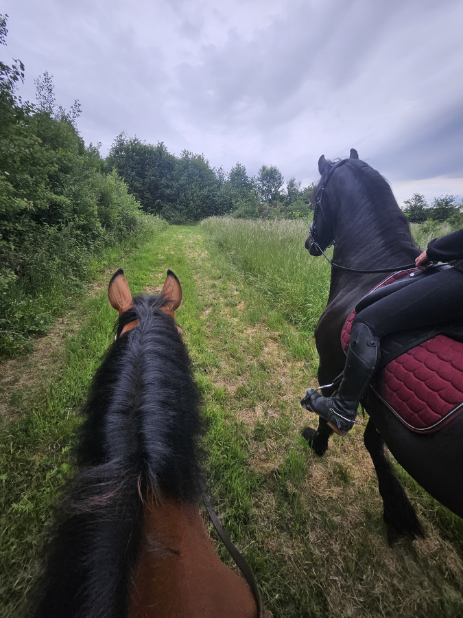 6.80 kms ce matin avec M et sa frisonne, on a refait un tour à côté de l'écurie, M n'est pas encore trop à l'aise avec le fait d'aller sur les autres chemins car il faut longer la route sur un bon kilomètre et elle craint un peu, ce que je comprends, alors on s'adapte ^^.