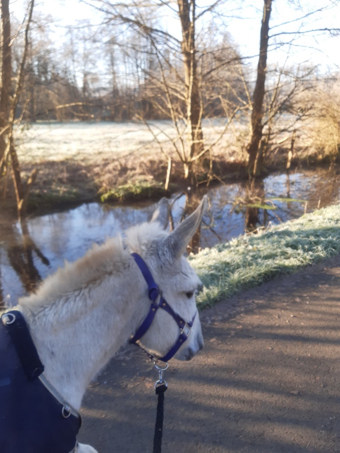 Et Lotus s'est dépêché de venir mettre son licol pour une promenade. un peu plus de 6 km, on a vu pas mal de prés inondés, des copines ont eu de l'eau dans leurs abris, alors nous on a "que" de la bouillasse, mais il nous reste quand même quelques M2 où ils peuvent manger les pieds au sec.