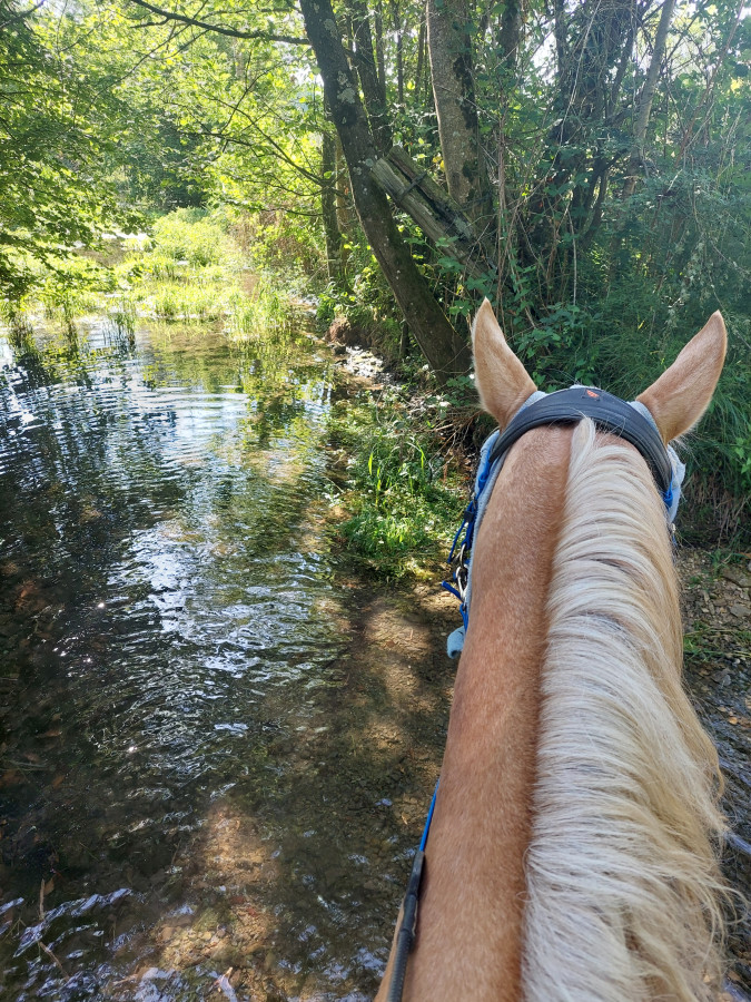 Sortie tranquille à cause de la chaleur mais super. Elle est restée au pas dans les montées et des beaux allongements au trot sur le retour même si un peu trop ouverte car un peu stressée d'être solo.