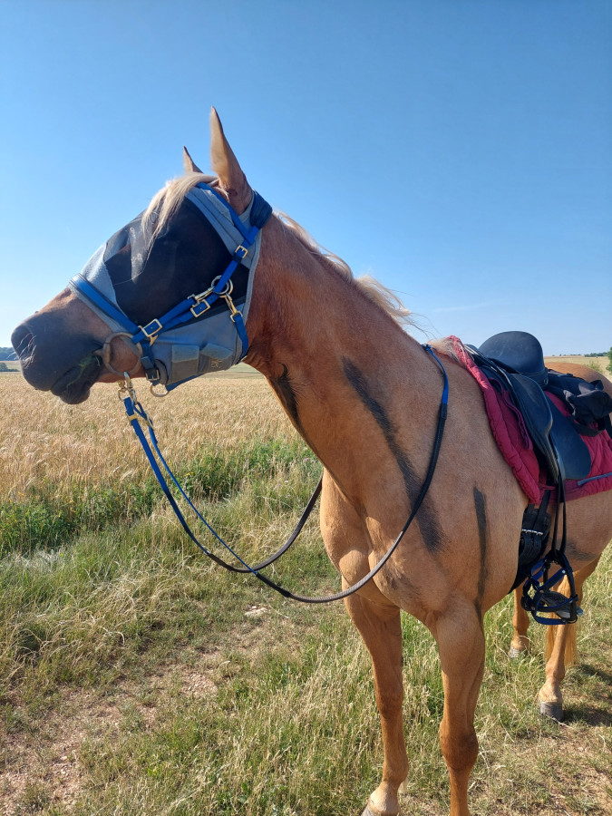 12km7 entre plaine, bois et petit tour à la rivière. Time n'a pas voulu y resté longtemps. Heureusement j'ai mis de l'emouchine et je lui ai laissé son masque. Les insectes l'ont laissé plutôt tranquille.