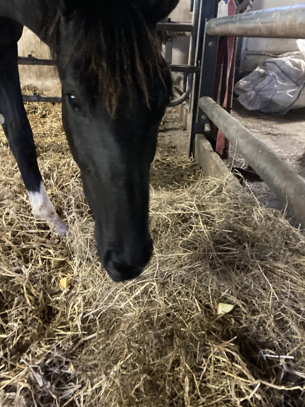 Et trop drôle, on lui a mis un petit peu de préfané horse dinner à côté du foin, il s'est littéralement jeté sur le préfané
