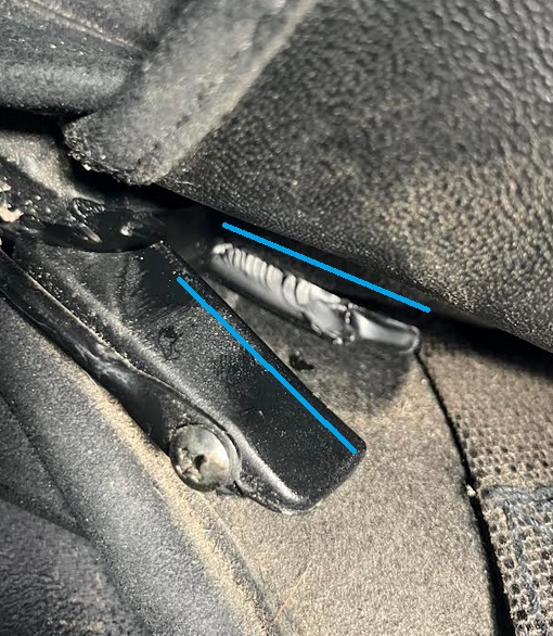 Photo 3 : on voit mieux en soulevant le quartier. La pièce métallique a cassé le long des deux traits bleus, si cela peut vous aider à comprendre.