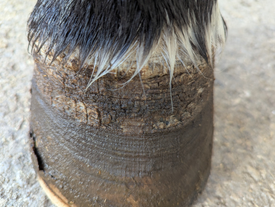 L'hypothèse est que cette coronite est liée à un "défaut de maréchalerie" avec un pied trop long, trop peu de talon etc. Ce défaut engendrerait des contraintes fortes sur la paroi du sabot.