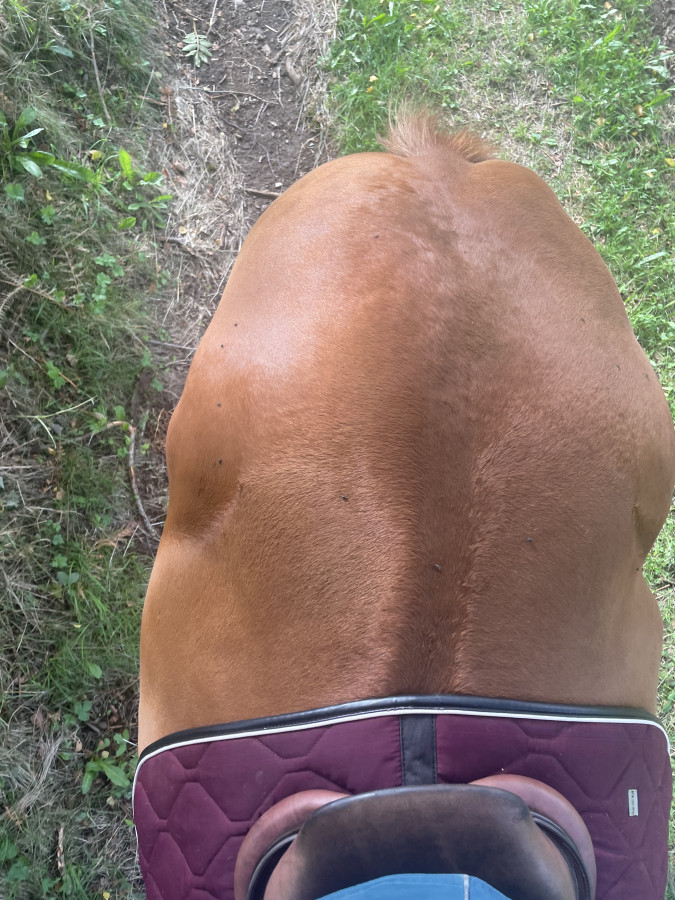 Je ne sais pas si c'est vraiment visible la différence, mais maintenant il a le ventre qui dépasse sur les côtés et cet espèces de bourrelet typique des chevaux obèse sur la croupe.