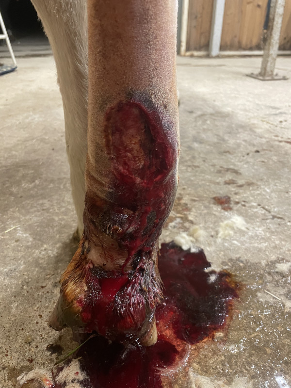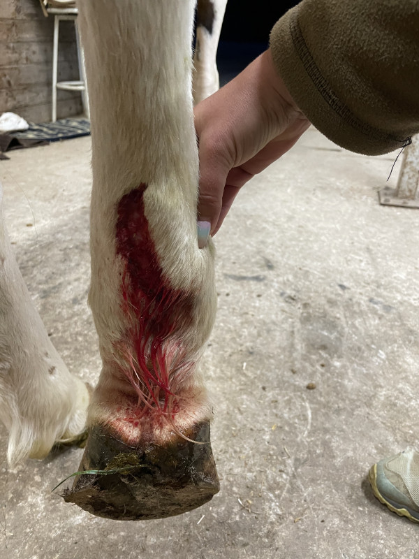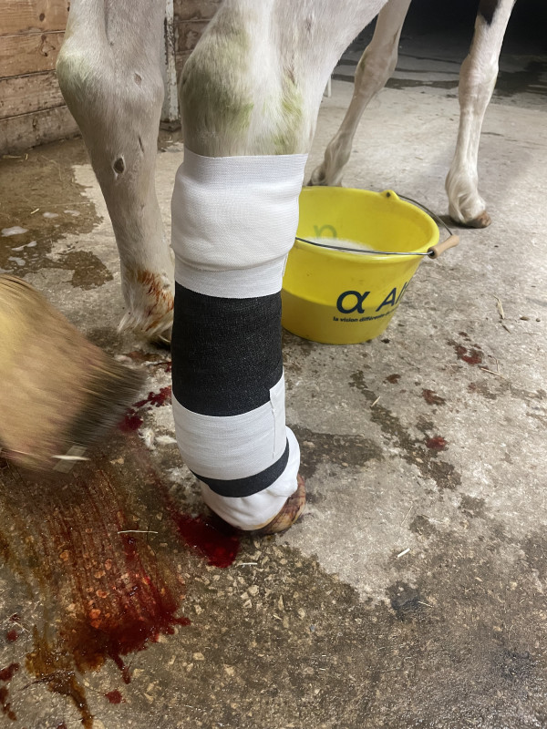 Ma jument s'est blessée au pré il y a 8 jours au niveau d'un postérieur. Plaie franche et béante sur 8-10 cm comme un scalp, n'a pas touché le tendon (ouf !). On suppose un coup de sabot car absolument rien dans le pré n'explique cela.
