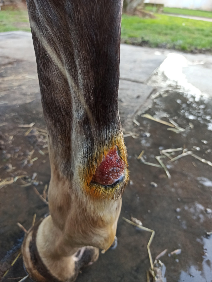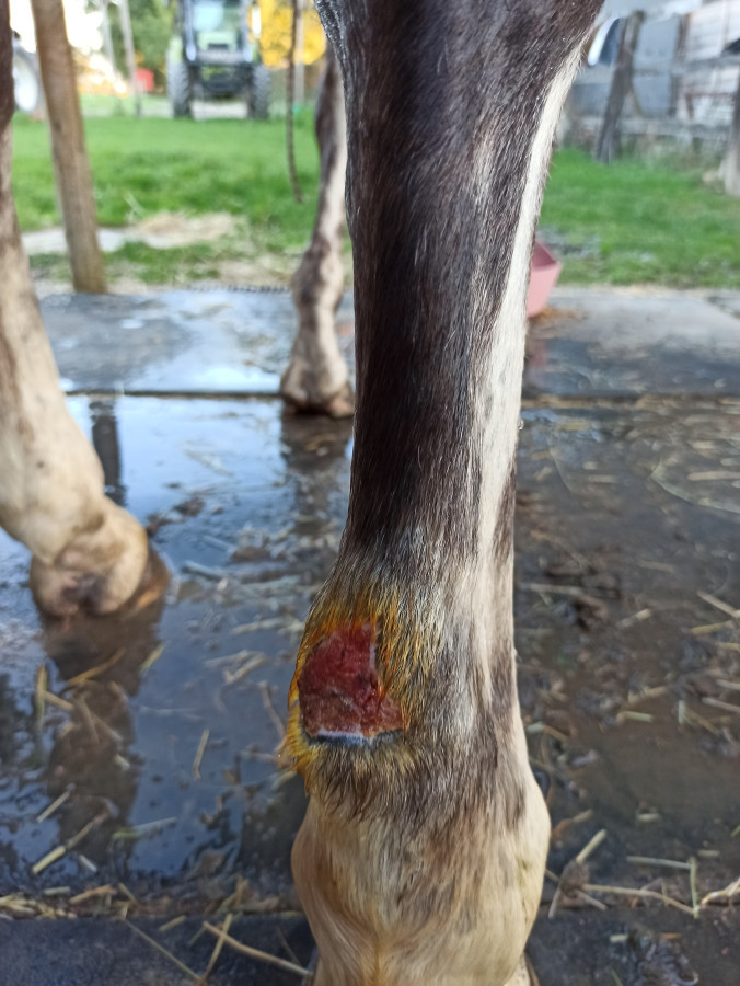 Ma jument s'est blessée au pré il y a 8 jours au niveau d'un postérieur. Plaie franche et béante sur 8-10 cm comme un scalp, n'a pas touché le tendon (ouf !). On suppose un coup de sabot car absolument rien dans le pré n'explique cela.