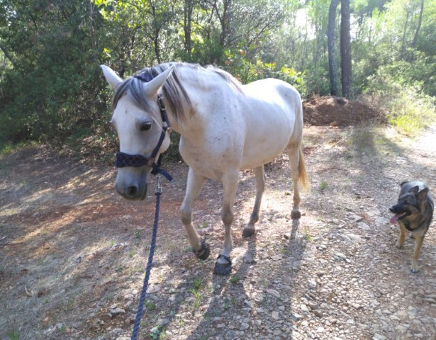 Pour une fois, ça s'est bien passé avec Théa (la chienne). Elle est super pénible au quotidien avec les chevaux, mais aujourd'hui elle était calme et a fait sa petite vie à renifler des odeurs sur le chemin.