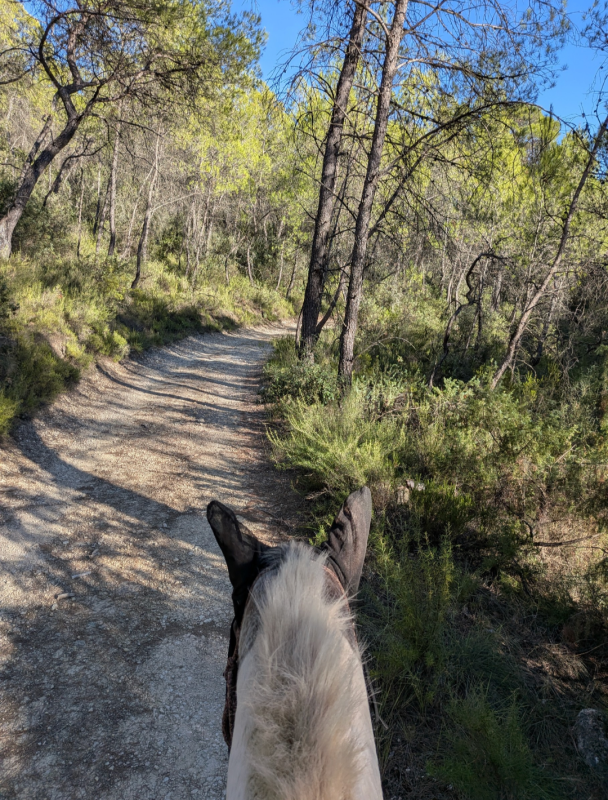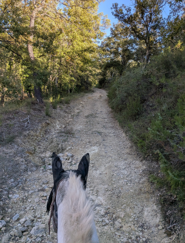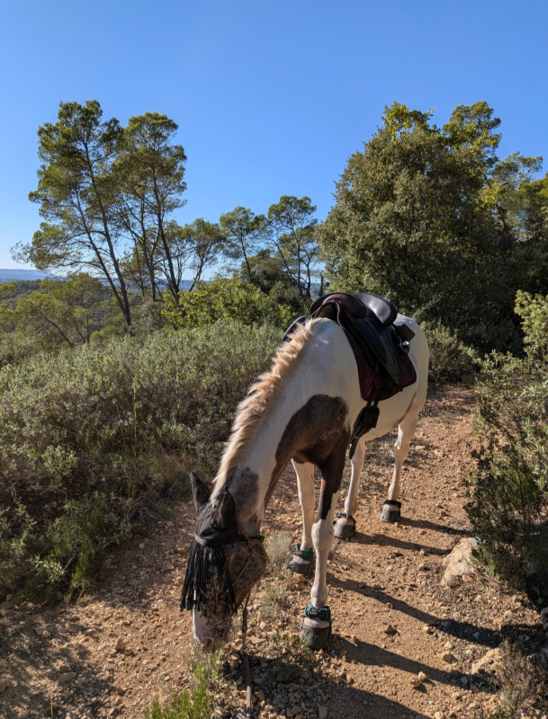 On fainal, nous avons fait 8km, dont 6 en selle. Et, contrairement à la semaine dernière, Titi n'a pas été pénible au montoir. Par contre elle a un peu buggé dans un sous bois. Elle s'est mise à marcher en crabe et à ronfler... Il me semble avoir vu des traces au sol qui pourraient être du sang... Une battue a dû passer par la dans le weekend