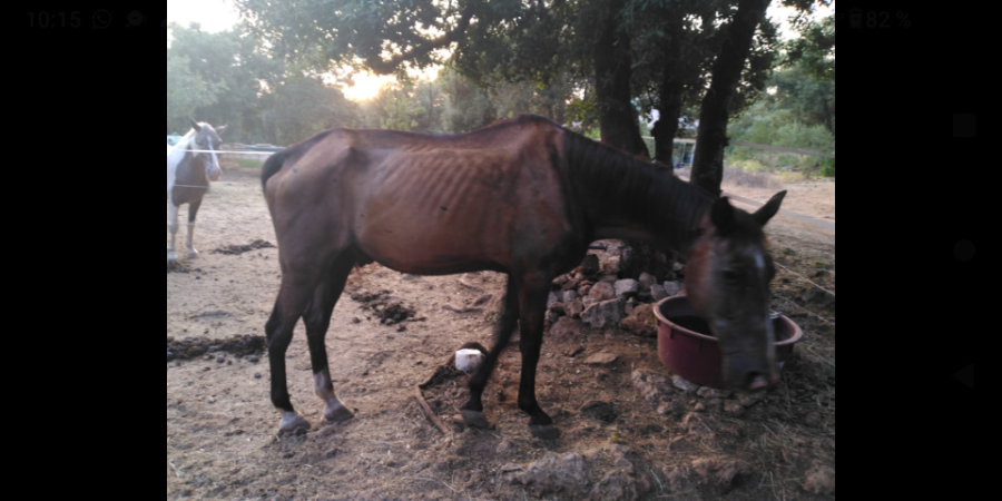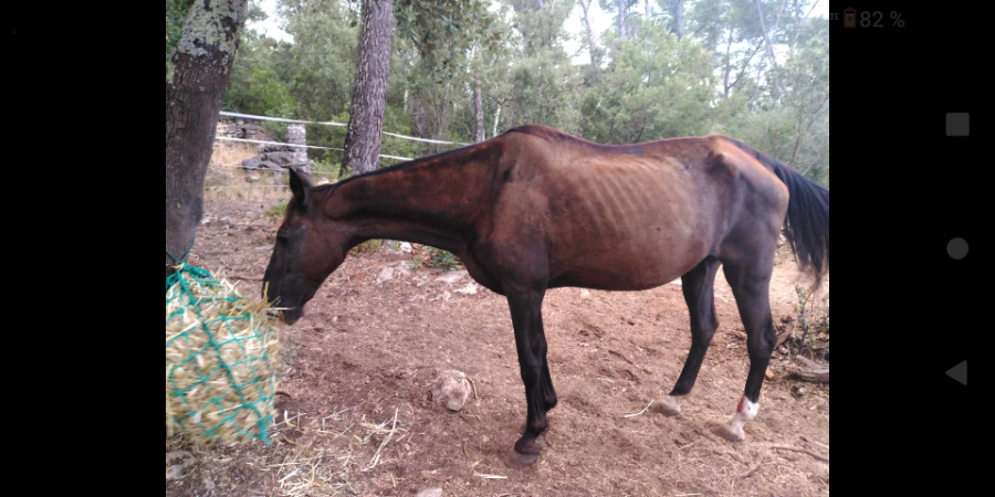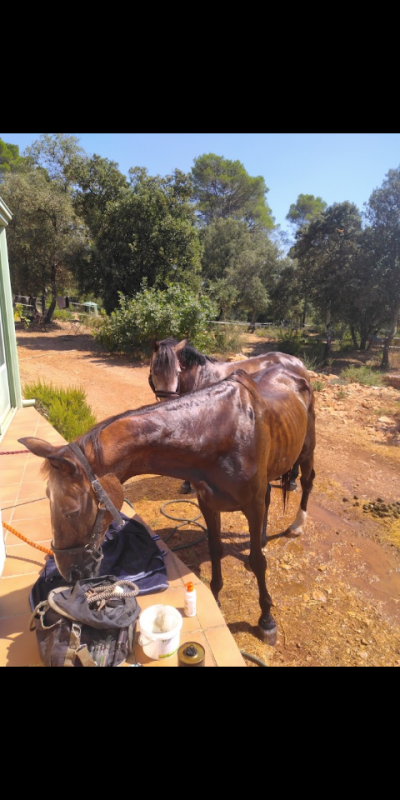 Une autre chose me tracasse... Le cheval mouche un peu et ne respire pas très bien. Il est aussi très maigre. Les propriétaires l'on passé depuis quelques temps au wafer + grains senior pour qu'il reprenne de l'état... Ce n'est pas de bonne augure.