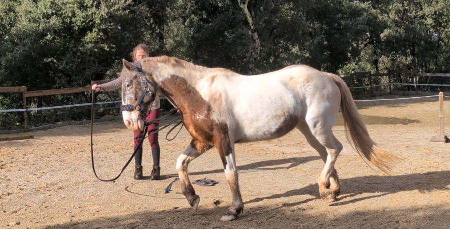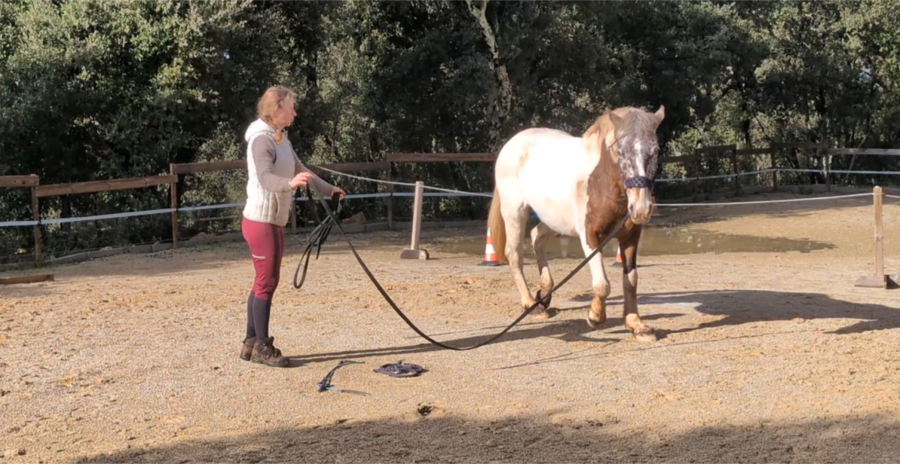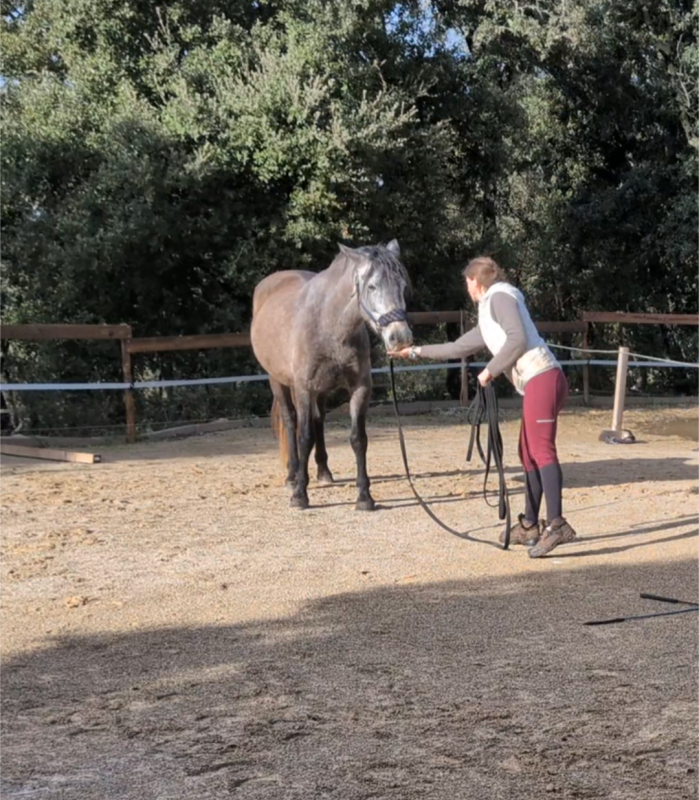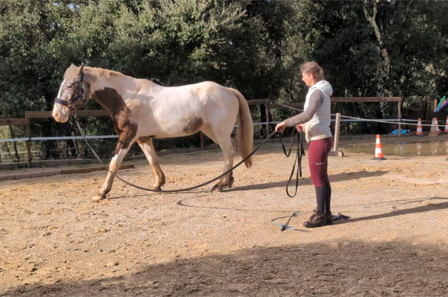 Constance : 10min. Le travail consistait à simplement tenir un beau cercle au pas en mode "cheval autoporteur". Puis, travail sur les demandes de transition montantes vers le trot.