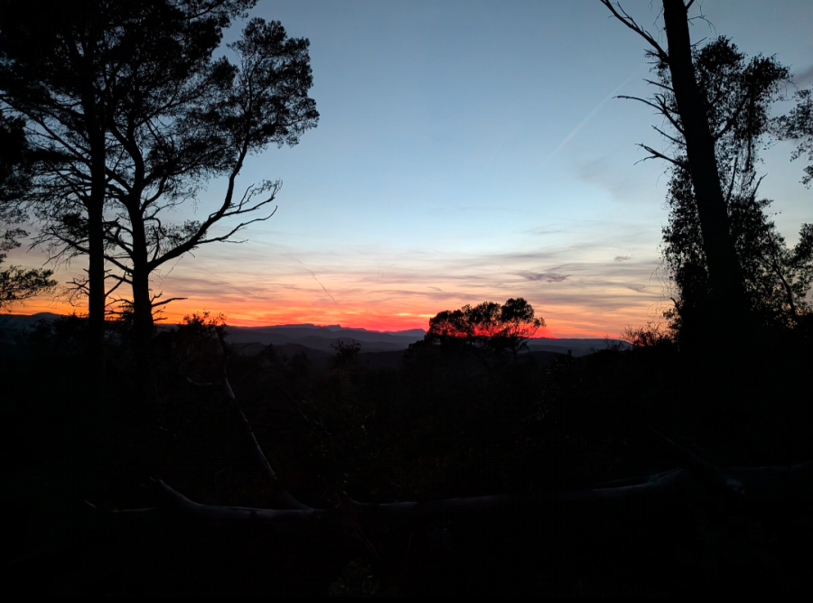Arrivée en haut de notre colline avec un coucher de soleil de fou!