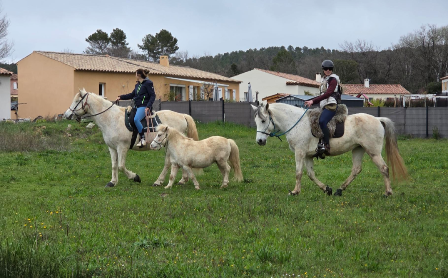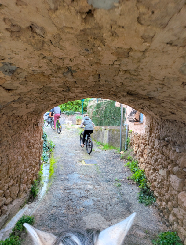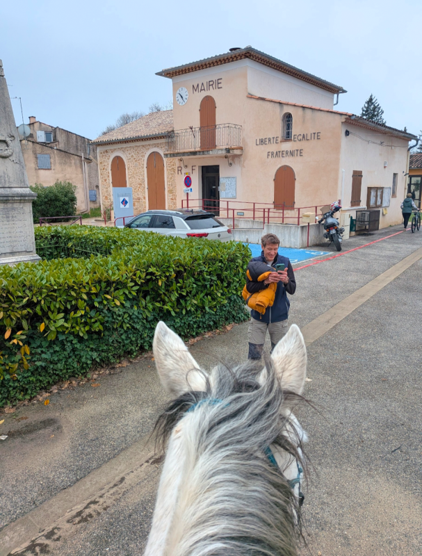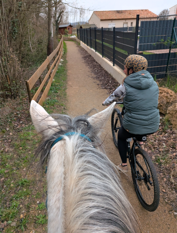 Arrivée à l'entrée du village on retrouve une copine, cavalière aussi, et sa petite famille qui étaient descendus en vélo.