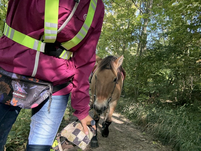 On est repartis sereinement, toujours rênes longues. C’est marrant parce que, du coup, il observait beaucoup son environnement (plus que d’habitude). J’ai eu l’impression que ça lui a fait tout drôle d’être complètement rênes longues au début ! Quelques foulées de trot pour bien le détendre aussi. Comme à son habitude, il s’est de lui-même mis sur l’herbe afin de soulager ses petits pieds. Quand il aura ses hippo-crocs