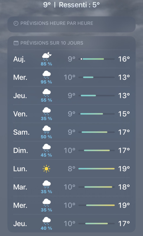 Pfff ils annoncent risque de pluie toute la semaine… Le pire étant aujourd’hui et demain. Bon et bien on va s’adapter. Peut être que je n’irais pas ce matin mais cet après-midi. Je pense que j’ai plutôt intérêt de rester à pied aujourd’hui et plutôt monter vendredi et samedi. Je vais voir. Heureusement que je suis flexible.