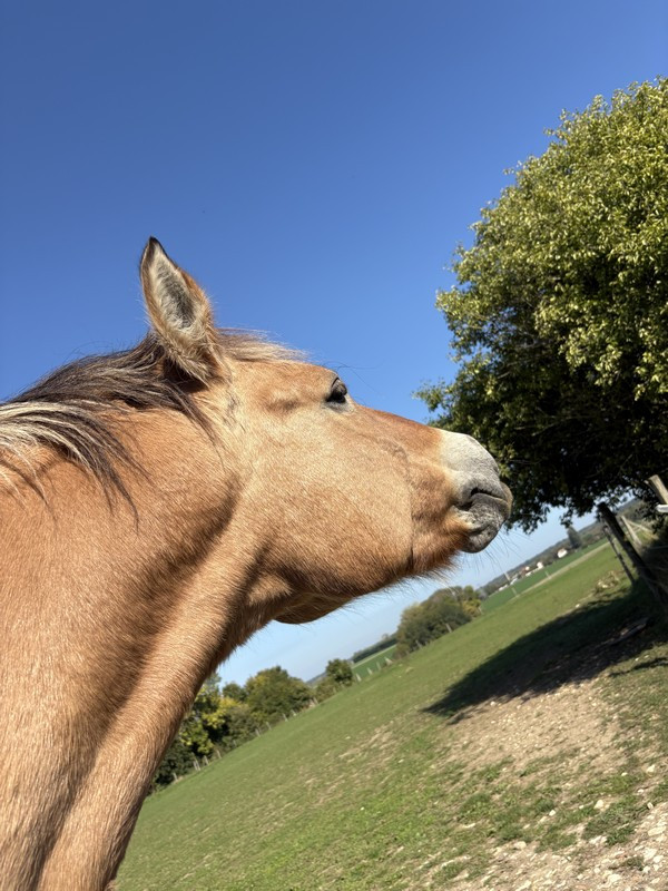 Sur le chemin du retour il avait du gaz ! Il s’est mis au trot tout seul, port de tête haut. J’ai mis ça sur le compte de son envie de retrouver ses copains, et en fait je crois qu’il avait dû sentir quelque chose dans la petite maison (le local des messieurs, justement) qui fait l’angle. Sûrement les chiens. Je le rassure et dès qu’on l’avait passé, plus rien. Donc je pense à coup sûr qu’il avait senti un truc.