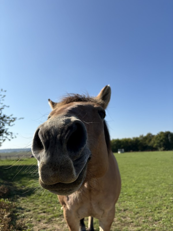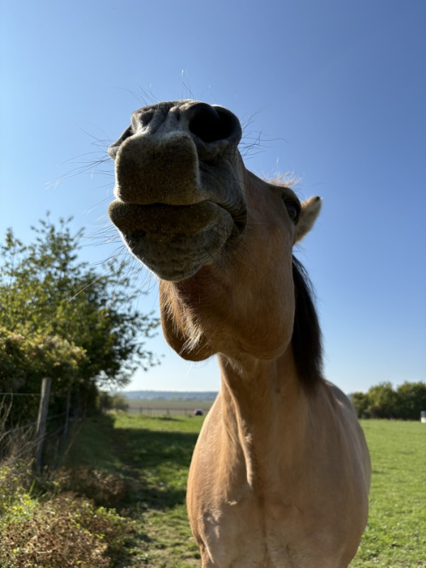 On a discuté un moment, elle a caressé le poilu et a même posé sa tête sur son nez pour écouter sa respiration. Un super moment, ça fait plaisir. Et là elle me confit que sa chienne, qui était à côté, c’était la première fois qu’elle n’aboyait pas et restait calme à la vue d’un cheval. C’est sûrement qu’Amour dégage quelque chose de rassurant ou en tout cas n’étant pas une menace pour cette chienne.