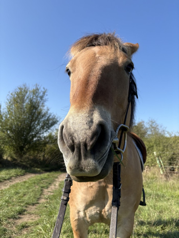 Et là… je vois un monsieur sortir de l’aire de pansage. En fait, le pré est en hauteur, un peu isolé par rapport à l’écurie, tout au bout d’un chemin. À la fin de ce chemin, il faut tourner sur un minuscule sentier à droite et on arrive sur un grand espace d’herbe, avec le pré tout autour, l’aire de pansage et la petite sellerie sur la gauche. Le monsieur repartait dans l’autre sens quand je suis arrivée. Je le vois tourner un peu autour du pré. Bon. Je lui dis bonjour et je sors mes affaires. Et là, je le revois revenir avec un autre homme et un chien. Je demande s’ils cherchent quelque chose, et le premier m’explique qu’ils ont perdu leur chienne, qui s’est enfuie près du pré. Sur le moment, ça ne m’a pas fait rire : déjà je ne connaissais pas ce chien, donc s’il s’approche des chevaux ça peut être risqué, et puis il y avait le danger de la route pas loin. Heureusement, le propriétaire des prés a été averti, et il m’a dit qu’il connaissait les deux hommes, qui ont un local juste à côté du pré. Au moins pas de panique, tout le monde était au courant.