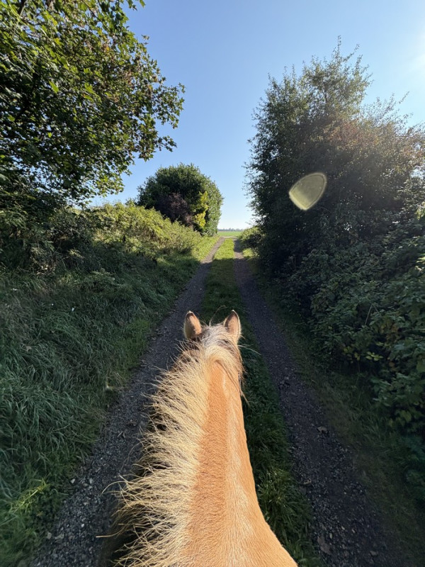 Ensuite, on arrive dans le village, puis on a poussé jusqu’au chemin découvert hier. Vraiment super coin, avec plein de possibilités à explorer. J’y reviendrai pour une balade dédiée, parce qu’entre les papotages et les arrêts ça faisait déjà une heure qu’on était partis ! On a juste pris quelques foulées de galop et on est repartis. Mais clairement, j’y retournerai. Ce coin mérite une balade a lui tout seul, ce n'est pas du tout une rallonge (ce que je pensais au départ). Donc demi-tour, on repasse par le village. Ensuite, on a donc enchaîné sur un chemin habituel.