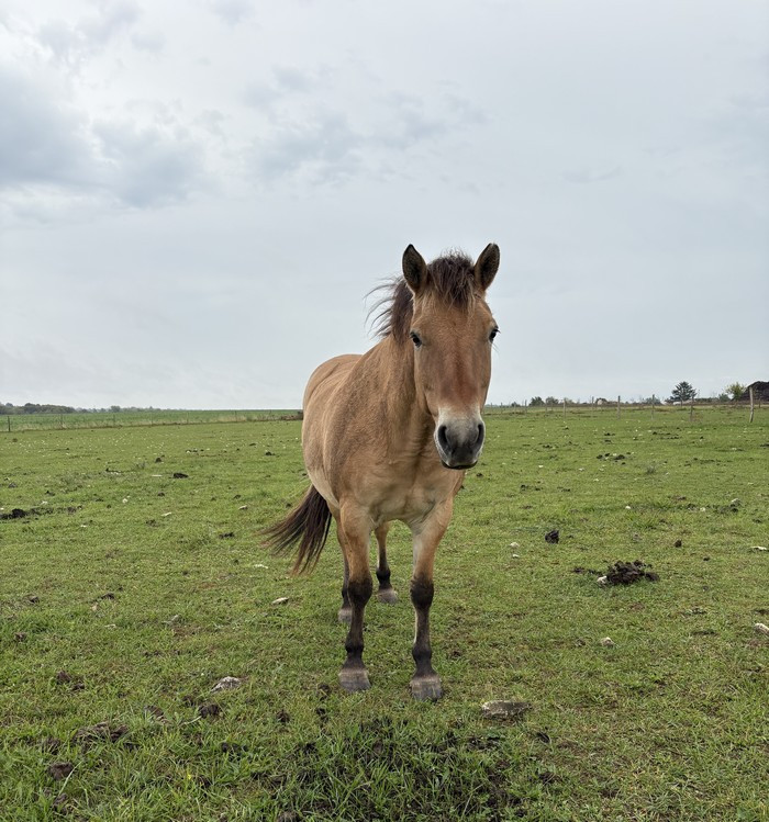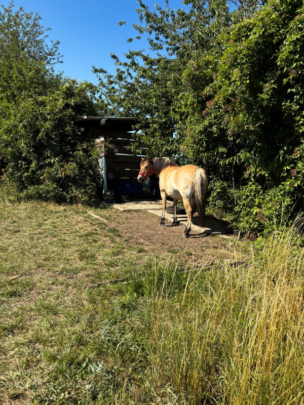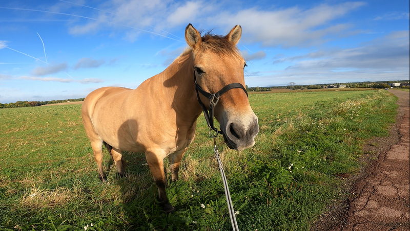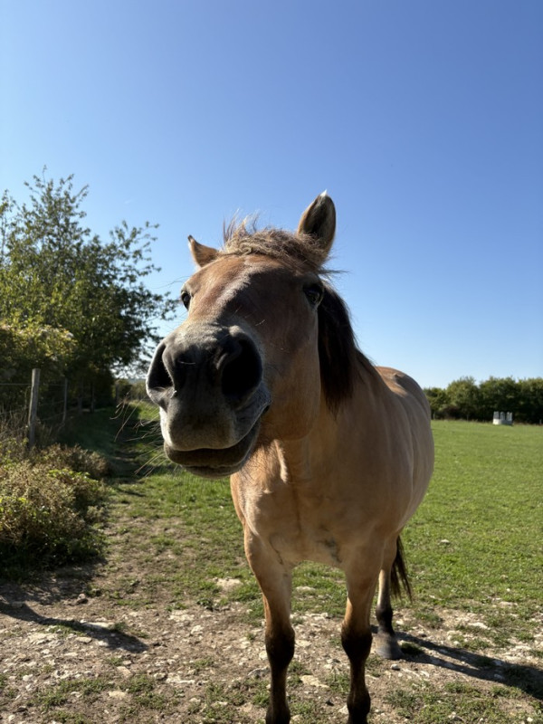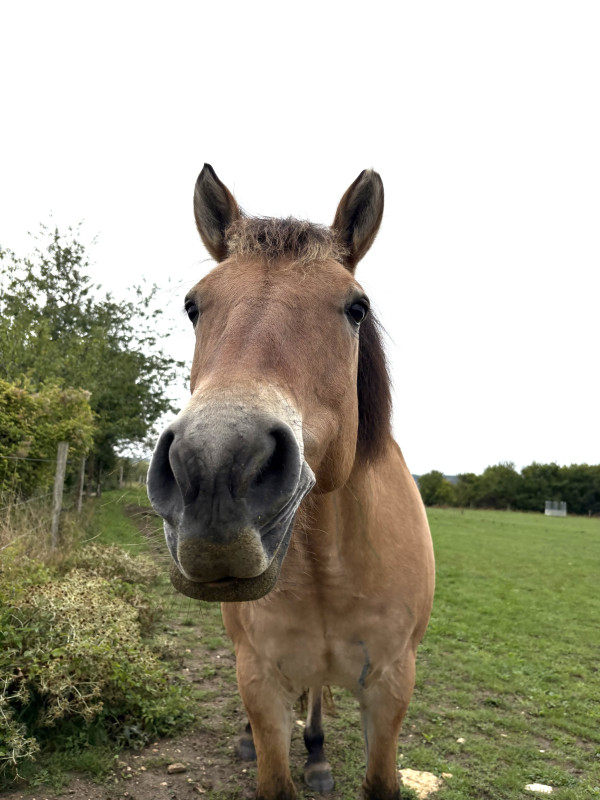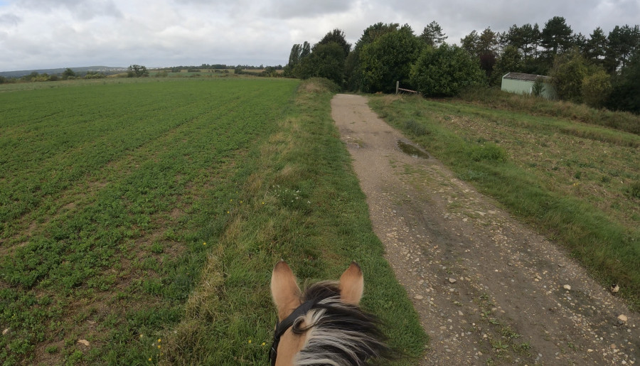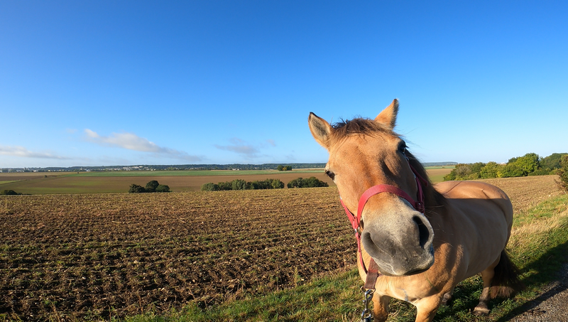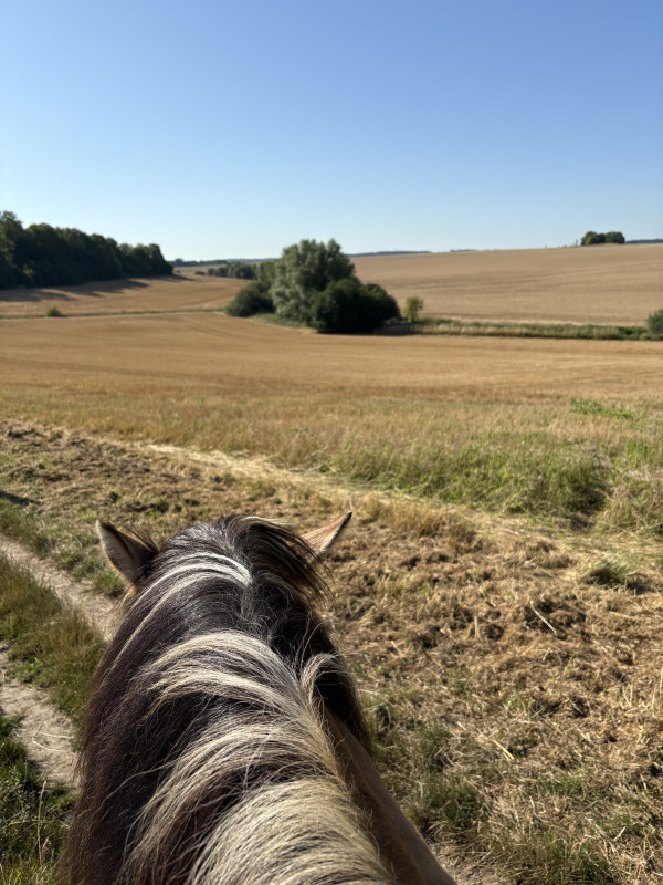 Mais là il n’était pas du tout connecté, bloquait beaucoup en main. On est quand même arrivés au bout du chemin (où il avait eu peur de la scie sauteuse, donc pas hyper rassuré, mais ceci dit c’est très bien qu’on soit repassés par là). On arrive dans la plaine, sur le petit chemin où il avait bien apprécié trotter la dernière fois… et rebelote : impossible. Il regardait au loin, tournait la tête, pas dans son assiette. J’ai essayé de le solliciter, mais rien à faire. Puis il s’est mis à tirer pour brouter. D’habitude, il va essayer de choper quelques touffes appétissantes, mais pas tirer, ce n’est jamais à ce point. Donc je lui relevais la tête avec le code vocal que j'utilise, un petit bout de carotte pour l’encourager, mais aujourd’hui c’était vraiment compliqué.