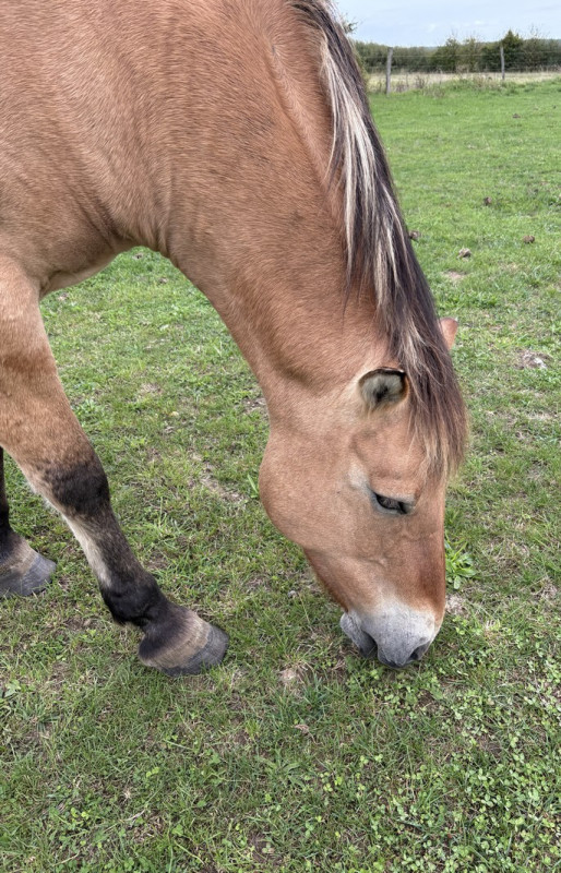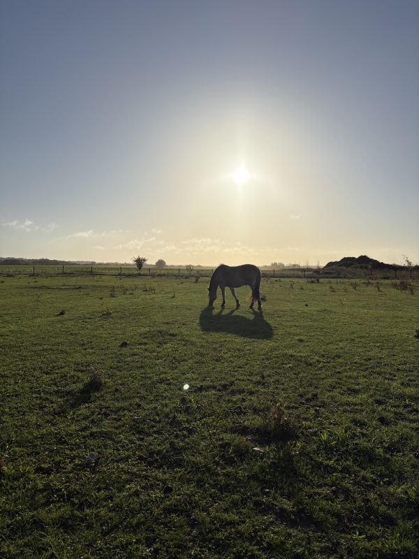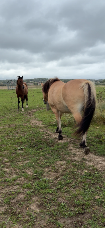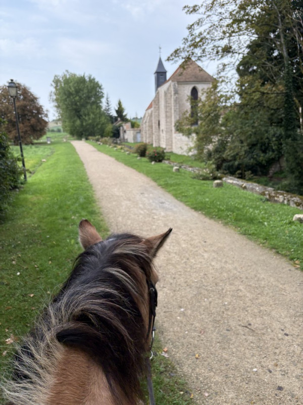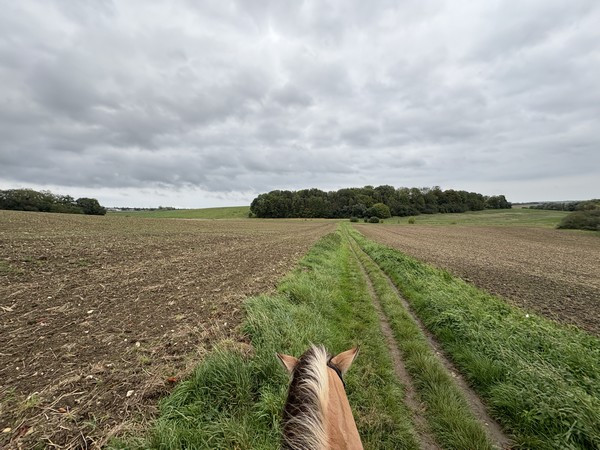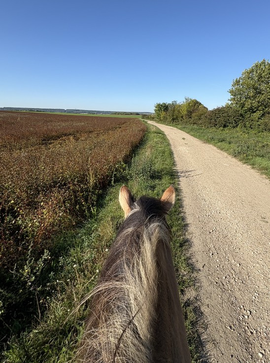 Il n’est pas rare qu’un cheval qui a mal soit plus “sur l’œil”. Donc je me dis que son inquiétude apparente, alors qu’il n’y avait objectivement rien et que c’était un chemin hyper connu, vient peut-être de là. Et son envie irrépressible de brouter, sûrement pour se rassurer et trouver du confort. Idem pour son envie de regarder ses copains de pré.