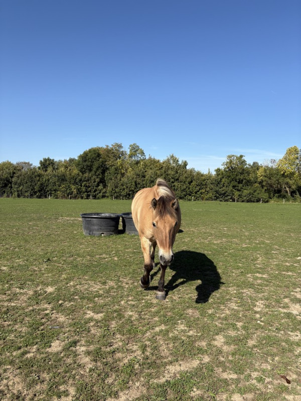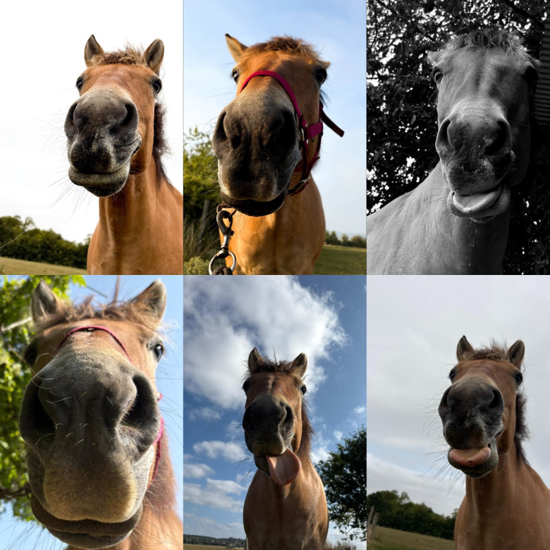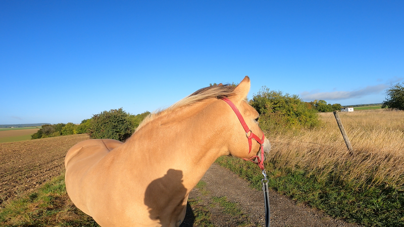 Demain, je vais retenter, mais sans pression. Je pense aussi utiliser mon licol noir pour les sorties en main. Le rouge est à sa taille, mais j'ai remarqué qu'il a tendance à “tourner”, se “désajuster” quand on part en main. Donc, à tester aussi.