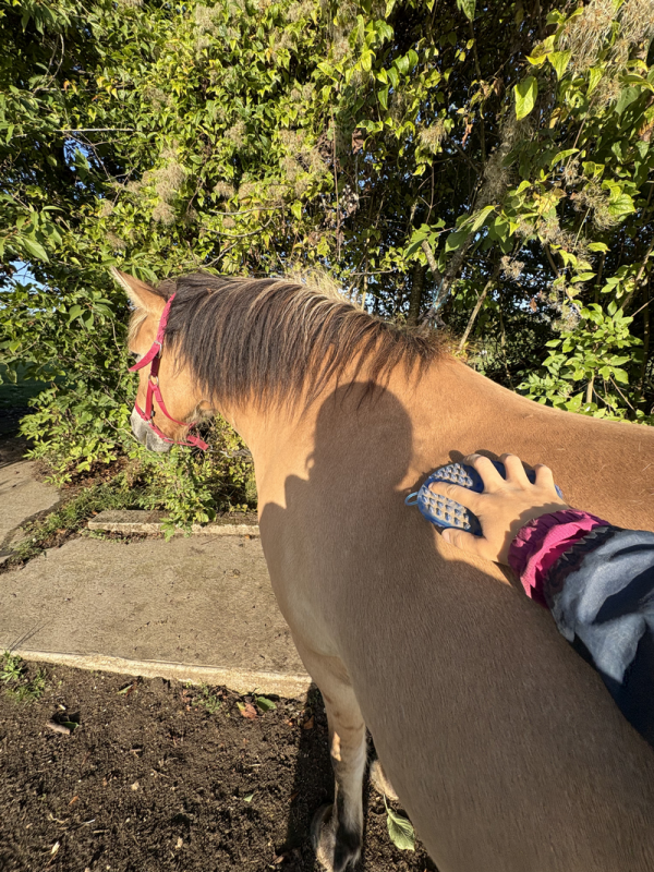 Et c’est là où je vois que c’est vraiment un gentil poilu : malgré mon “agacement”, il ne m’en a pas tenu rigueur. On est revenus au calme à l’attache, pansage retour, il a adoré l’étrille bleue de massage !