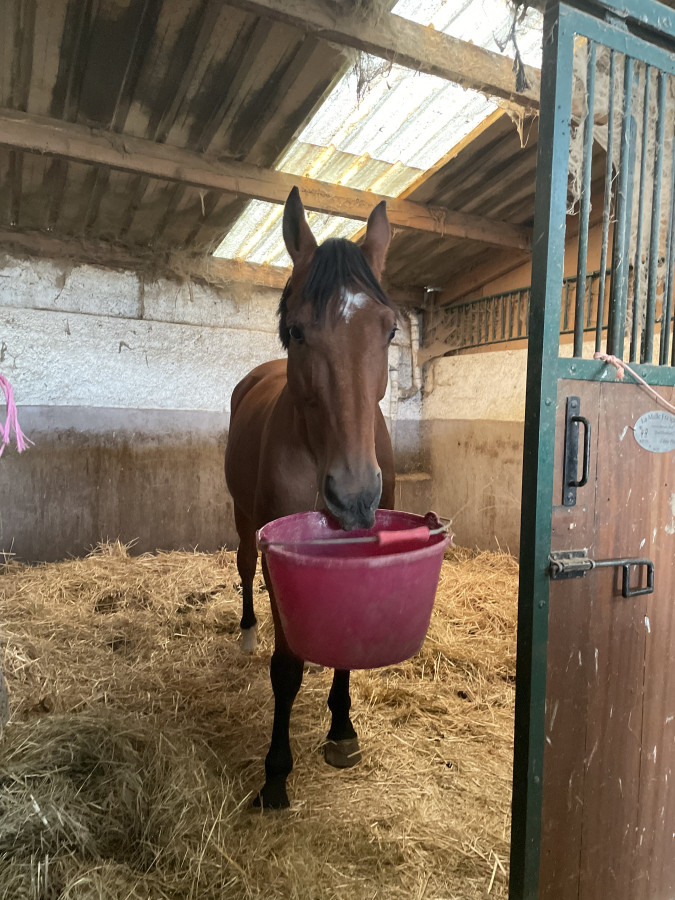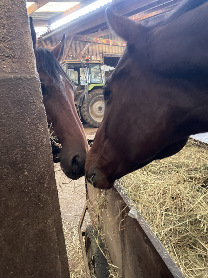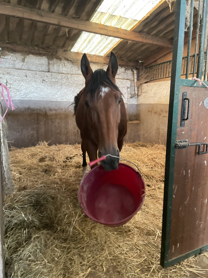 Et avec tout ça, bah je (enfin, on avec mon chéri ) fais tout. Le matin, je nourris tout le monde et je sors les chevaux. On cure aussi nous-mêmes nos box. En gros, si on ne fait rien, les chevaux ne mangent ni foin ni grain… sauf cas exceptionnel où S les gère.