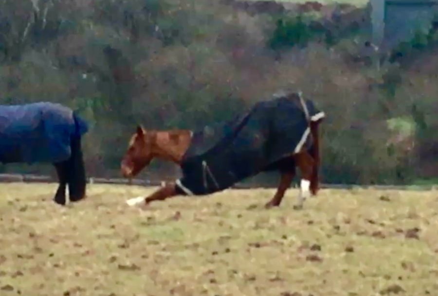 Typiquement le mien ça lui arrive quand il est relâché en général, rarement au travail (mais fin de séance, rêne longues, on peux finir au tas, ou quand je fait les pions ...) Et non il n'as pas du tout la souplesse pour se mettre dans cette position, il ne s'étire pas, c'est juste la narcolepsie (bon il est ataxique en plus, les 2 combinés font des dégâts quand il se réveille )