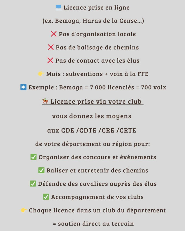 ? vous soutenez les actions qui profitent à tous : concours, randonnées, infrastructures, défense des droits des cavaliers.[/quote]