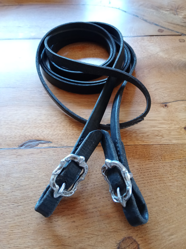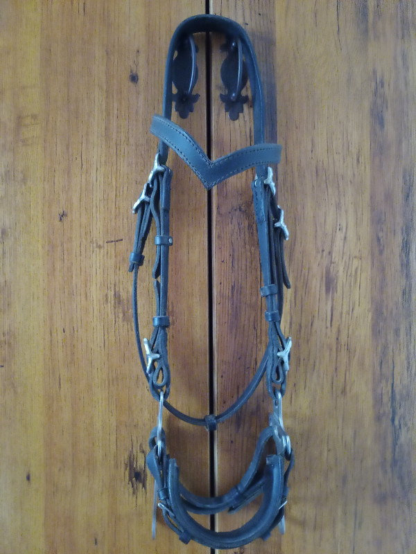 Bridon portugais taille cheval fabriqué par sellerie Ph?nix avec hackamore Sprenger et rennes de 3m avec boucles assorties.J'ai également la muserolle en V si vous souhaitez l'utiliser avec un mors.Les branches du hack. font 19cm,et la muserolle 5cm de large.Le tout est en excellent état.La valeur neuve du bridon est de 153?,j'ai la facture.