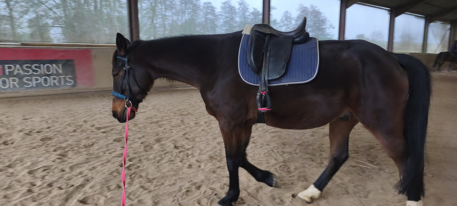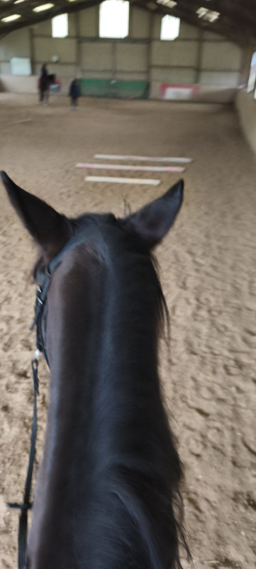 Donc je suis arrivée et il n'y avait personne sur place, cool ! Je prépare Kenou avec sa couverture chauffante, et j'en profite pour installer des barres au sol surélevées dans le manège, puis je vais pour le lâcher un peu, entre temps une autre fille que je connais était arrivée, on a mis nos chevaux ensemble, Kenor étant super cool avec les congénères... À peine le temps de jouer un peu que quelqu'un d'autre arrive pour monter ( avec la sympathie d'une porte de prison fermée) donc on récupère les chevaux et on se met à les bosser.