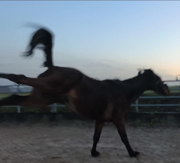 Lui qui ne savait pas tourner en longe il y a encore 2 semaines, est impeccable maintenant, très fluide et réactif, un bonheur. On va continuer aussi les longues rênes comme ça du coup.