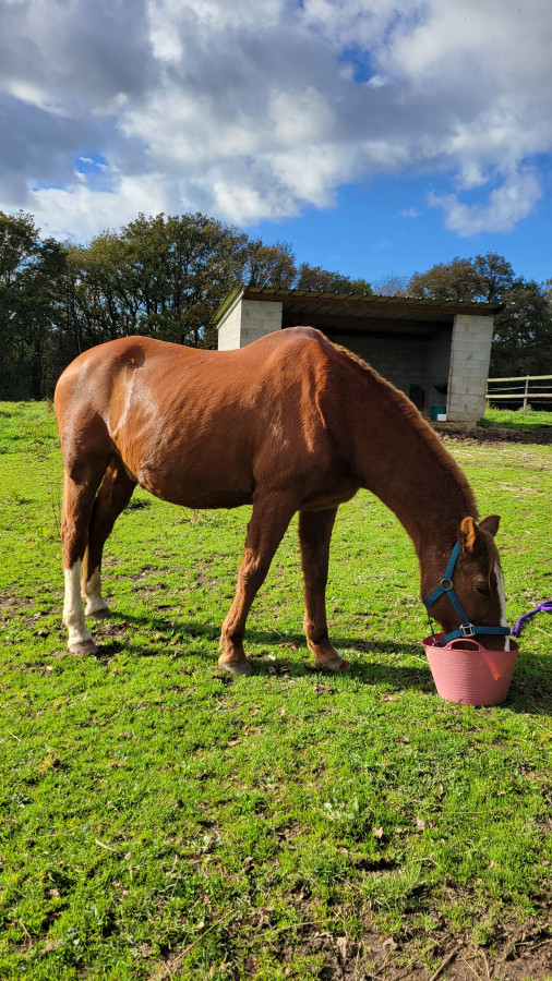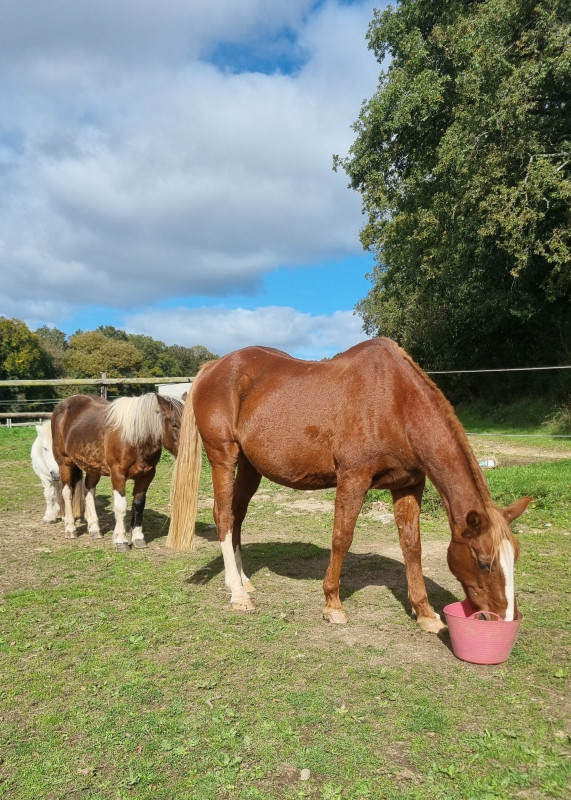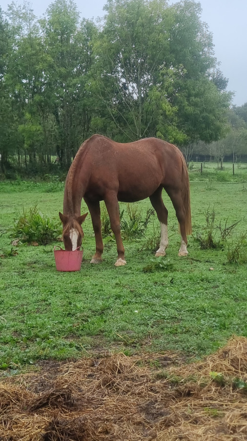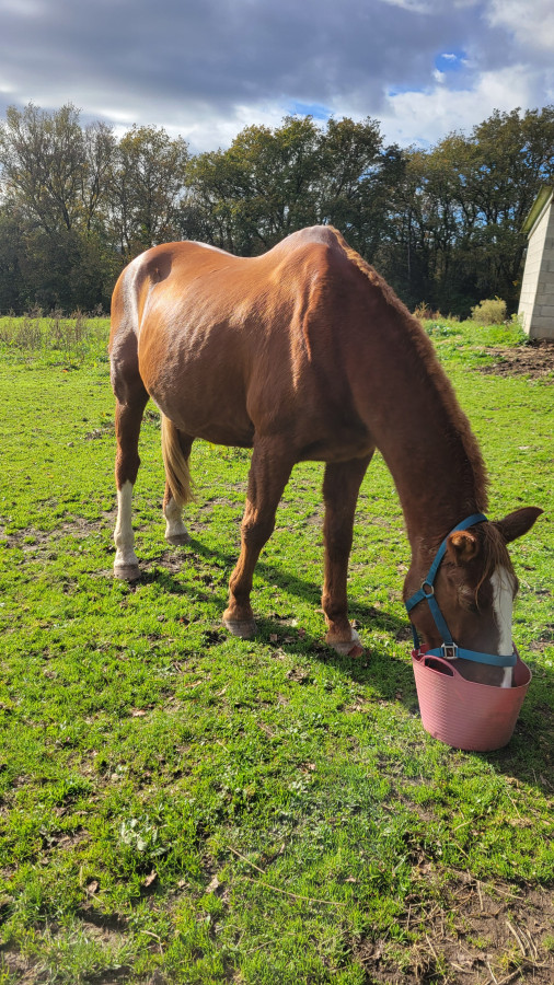 Il vit dehors H24, foin à volonté de qualité (mais il a tendance à mettre la tête dedans ...), ne travaille pas du tout. L'herbe est encore belle, il est beaucoup dehors à la grignoter.