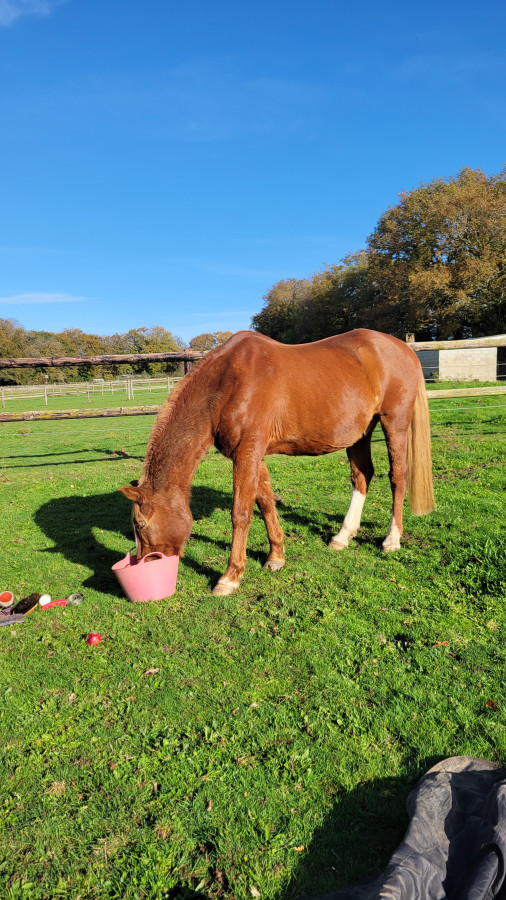Il vit dehors H24, foin à volonté de qualité (mais il a tendance à mettre la tête dedans ...), ne travaille pas du tout. L'herbe est encore belle, il est beaucoup dehors à la grignoter.