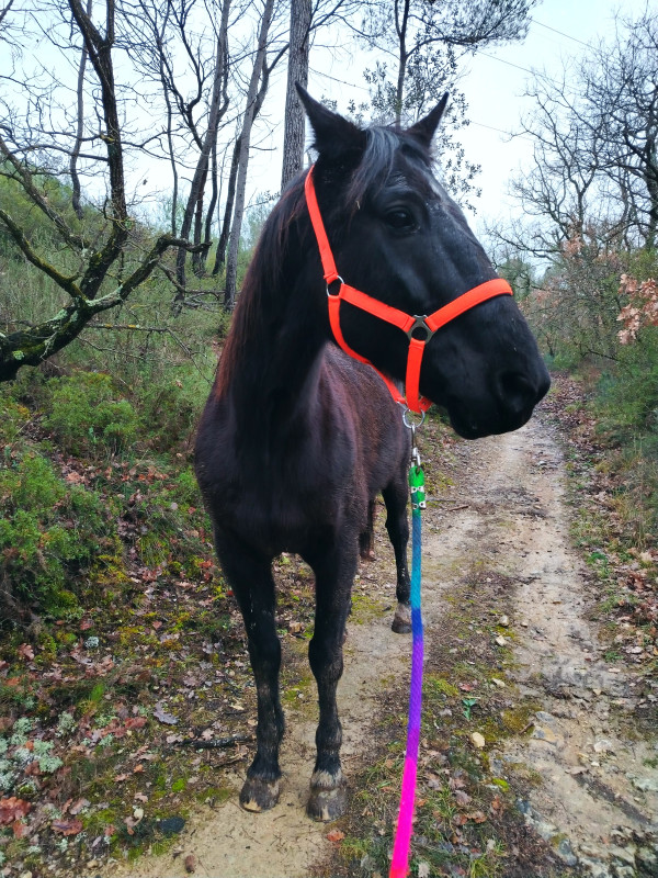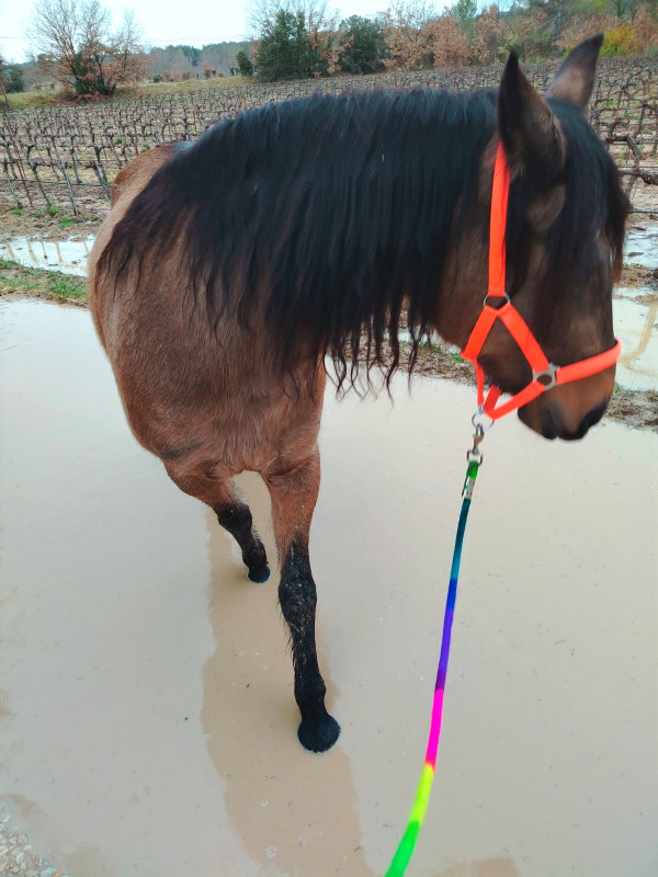 Nouveauté du jour: j'ai une longe autour de l'encolure "mode rando", aujourd'hui par curiosité j'ai essayé de l'utiliser comme en cordelette : Lui qui est deja fin habituellement, est encore mieux comme ça