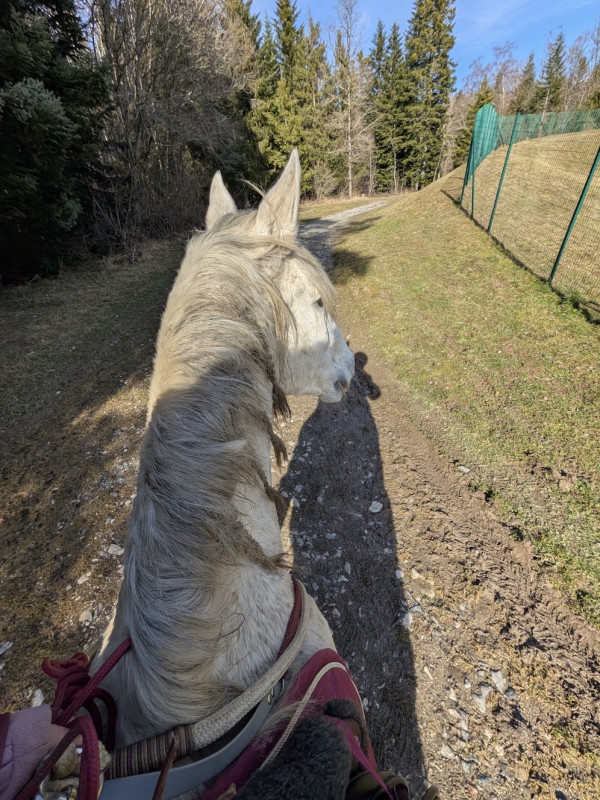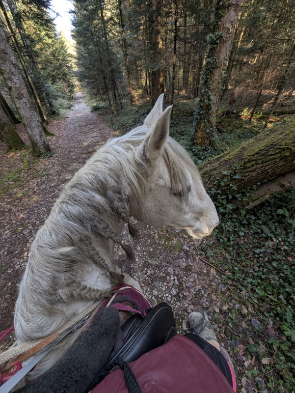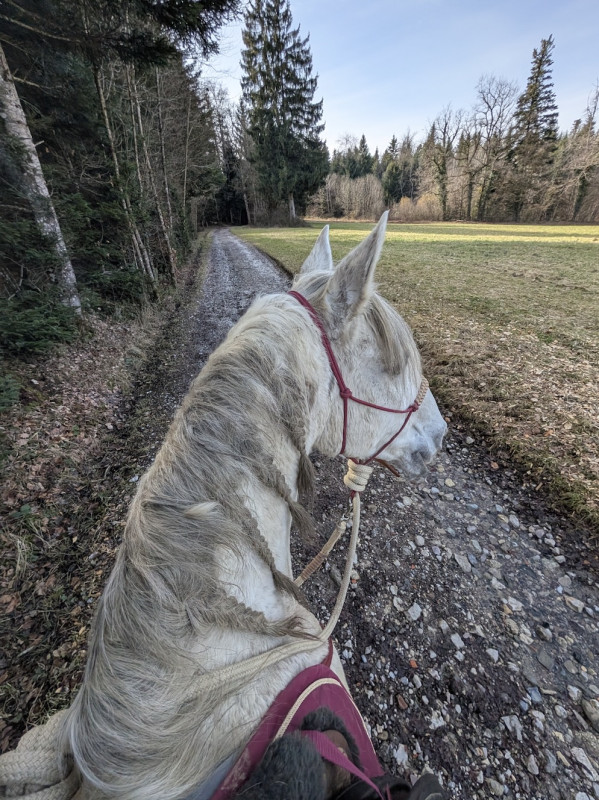 Evidemment c'est loin d'être parfait, il y a pas la réactivité dans les transitions qu'on a en carrière et je suis pas 100% sereine mais très fière de lui car ça faisait une éternité qu'on avait pas fait ! (en plus j'étais en galère à devoir tenir la cordelette + le licol et la longe lol)