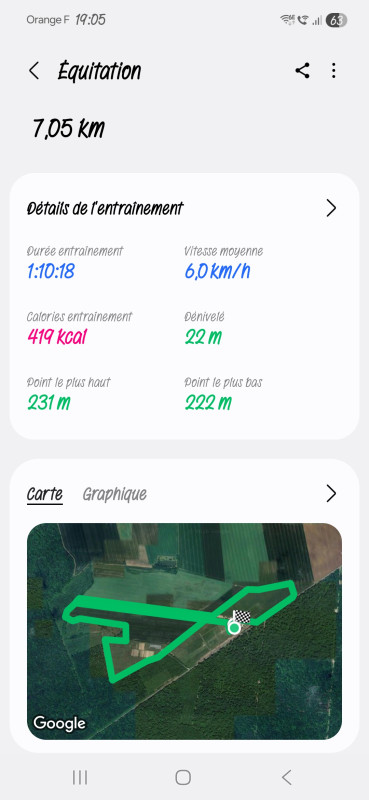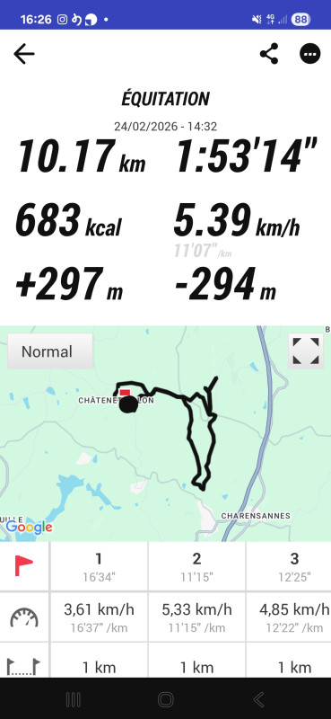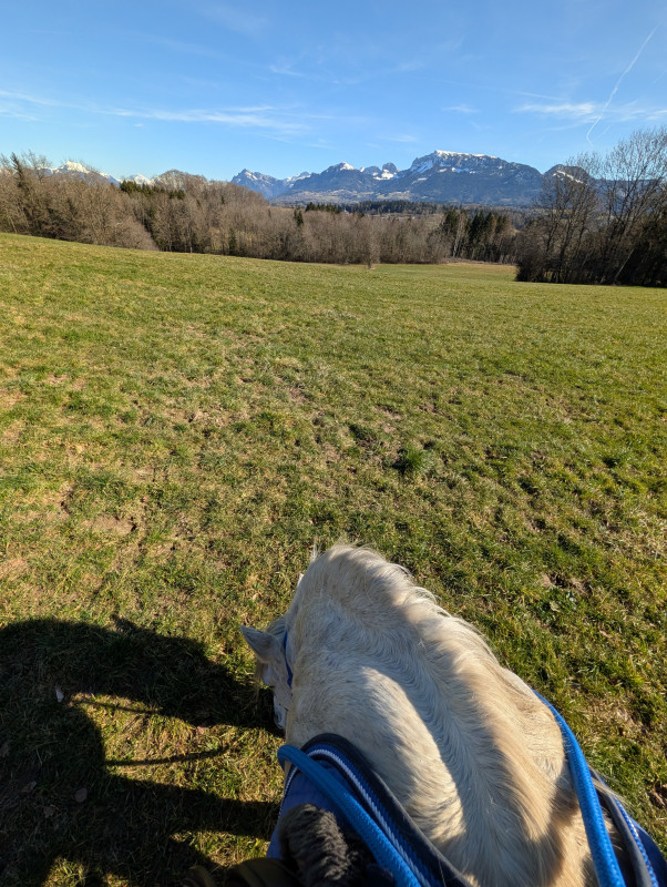 4 km aujourd'hui, où je ressors en solo une jument montée hier en balade. Elle avait du mal avec les transitions descendantes en groupe, donc on est allé retravailler ça seuls. Bien mieux même s'il reste de la marge d'amélioration.