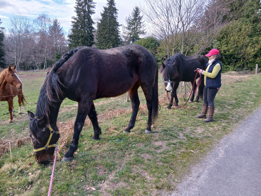 Ils ne se rendent pas compte de leur chance, ils ont été tous les jours à l'herbe (11h- 17h) depuis le début de l'hiver... (quand je vois Lotus faire la tête en voyant son panier, je lui propose d'aller faire un stage hivernal dans la pension du village voisin : box H24 avec 1 ration de foin... si le proprio ne vient pas sortir son cheval, il reste enfermé, le foin est distribué vers midi-15h max, la ration du jour en 1 fois... ) bref...