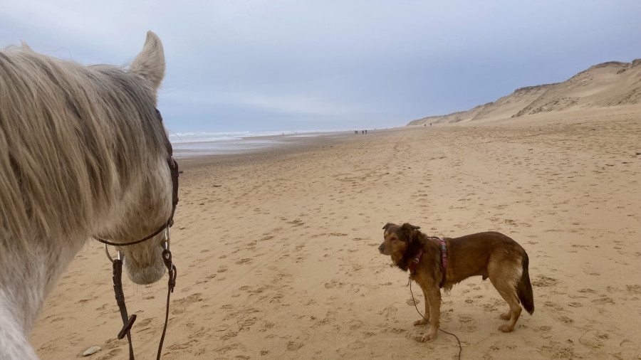 ce matin on a donc mené Lotus et Cisko, Pascal (sorti de l'hopital) nous a accompagné, 2x 600m ça lui a suffi comme sport pour sa journée... Avant de partir j'ai tondu Lotus, à peine 1 mois sans masser ses fanons au Sarnacuran et il se grattait... Ca lui fait un air de caniche, avec de grands poils des coudes aux genoux puis les arrières des jambes "nus"...