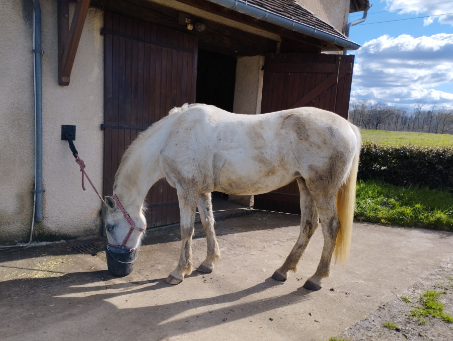 Je descend juste en fin d'après-midi pour mettre le foin dans le filet et sa ration.