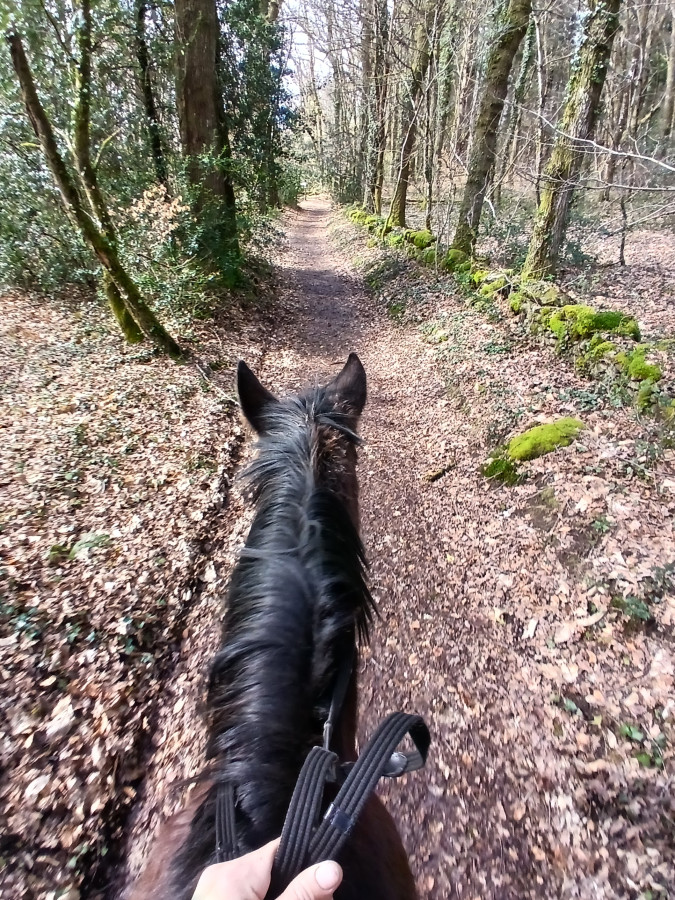 J'ai voulu prendre un petit chemin balisé qui traverse des bois privés. Il est souvent encombré de branches basses, l'idéal aurait un poney, pas ma grande jument mais ça nous ramène à l'ombre et ça l'oblige à se concentrer un peu parce que ça zigzag beaucoup.