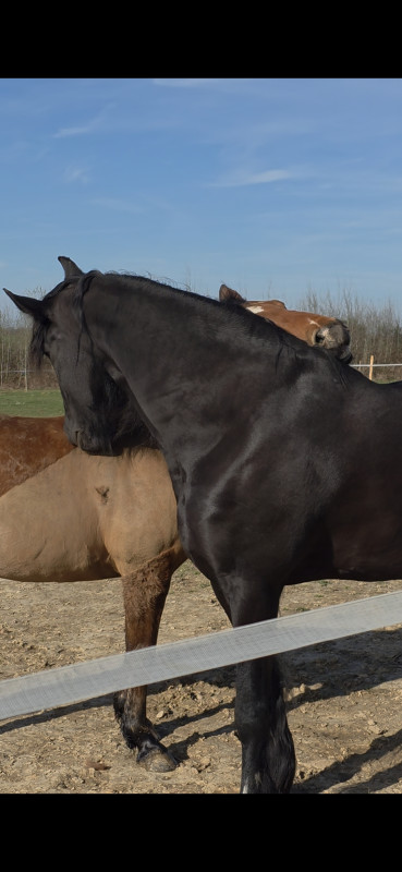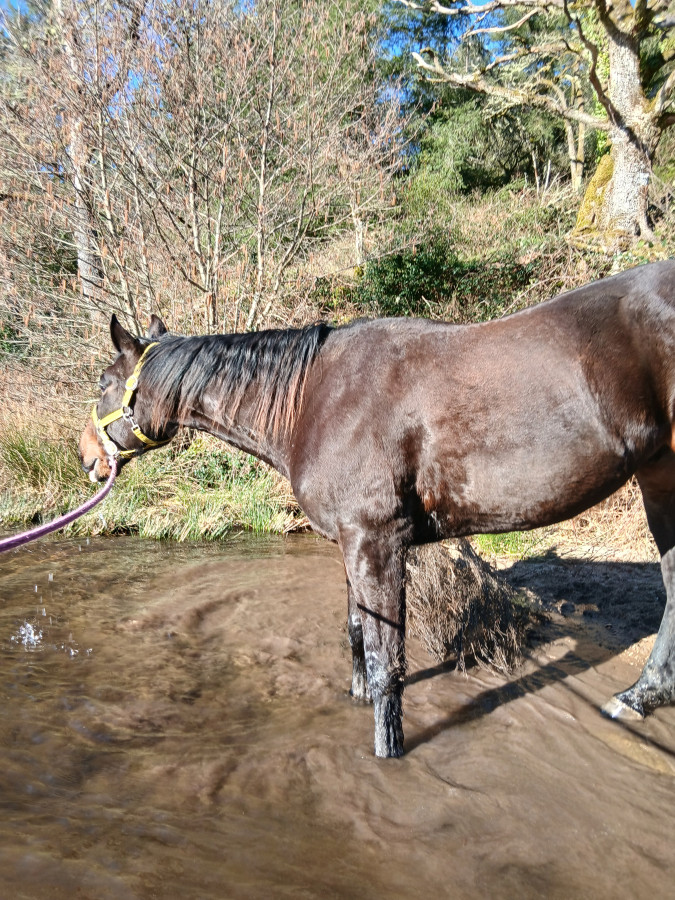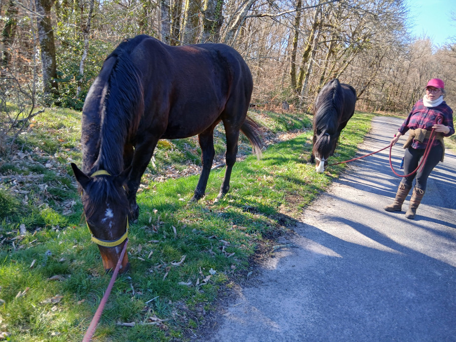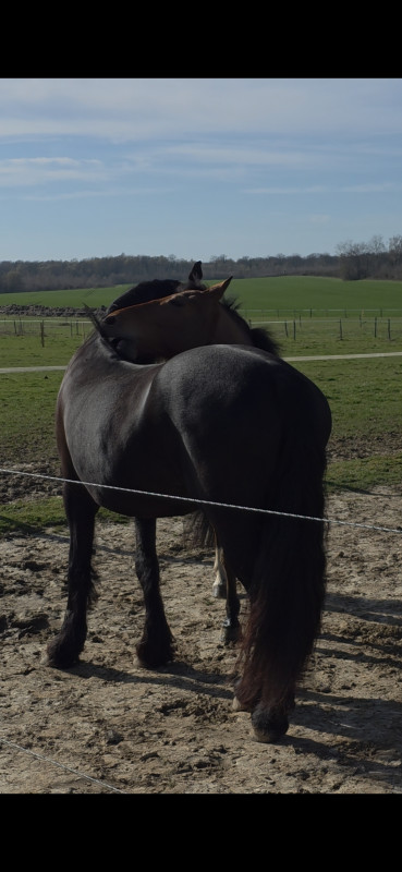 Il y a un pré d'hiver jusque fin avril, avec foin à volonté (ratelier + filet) un grand abri sous un hangar, les clôtures sont en 4 cm x 3 hauteurs sur secteur (gallagher)