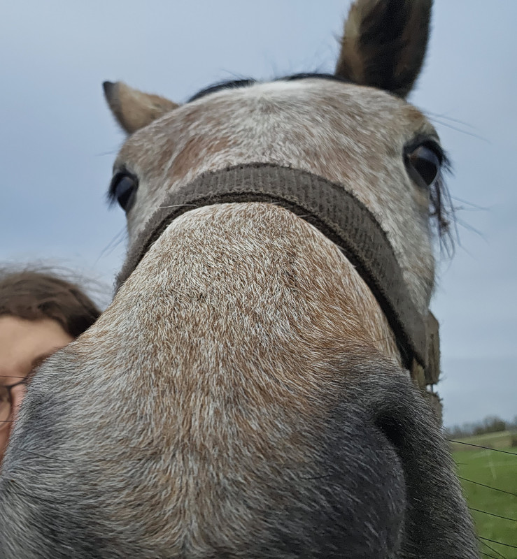 Elle est déjà bien manipulée : elle donne les pieds, se laisse brosser, licoler, fait quelques pas en main et me suit partout en liberté.