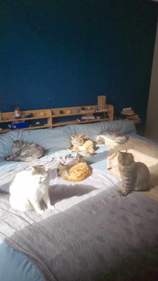 Là où ça charde un peu plus, c'est typiquement en ce moment où la pluie est +++ donc plein de chats sont forcés de se côtoyer dans 63m2 (+ hangar pourri + extérieur mais ils préfèrent la maison actuellement évidemment).