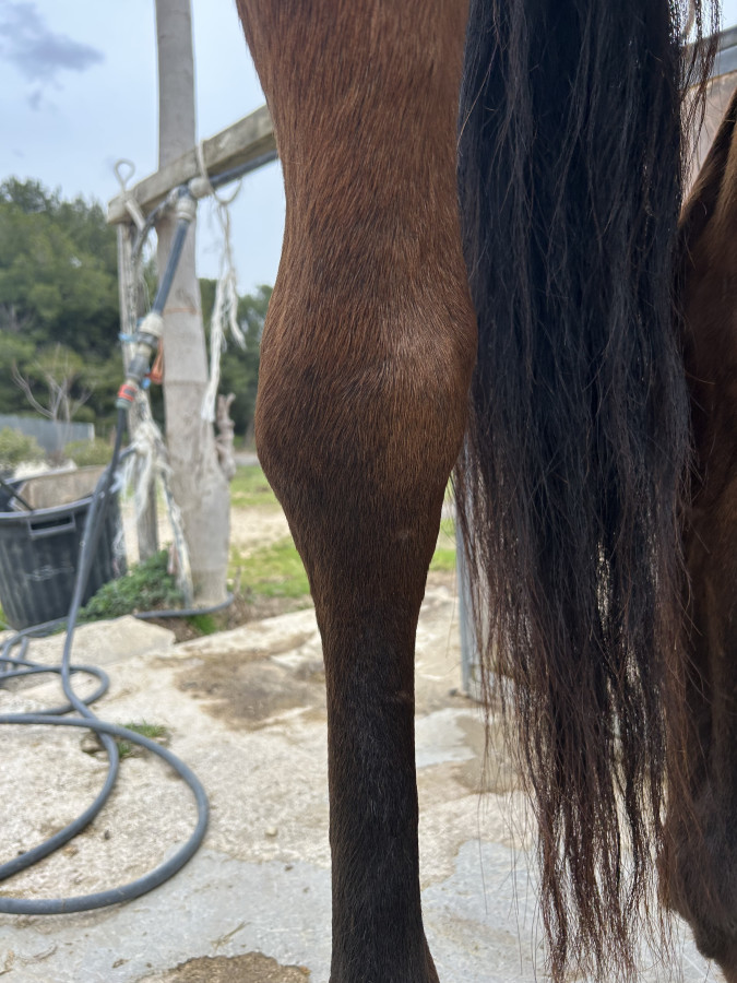 Du coup, j'ai douché, j'ai mis de l'argile, après la douche elle boitait quand même moins. Ce n'est pas chaud, en revanche c'est bien gonflé, elle a une poche dure et tendue sur la face interne du jarret. Voici sa démarche :
