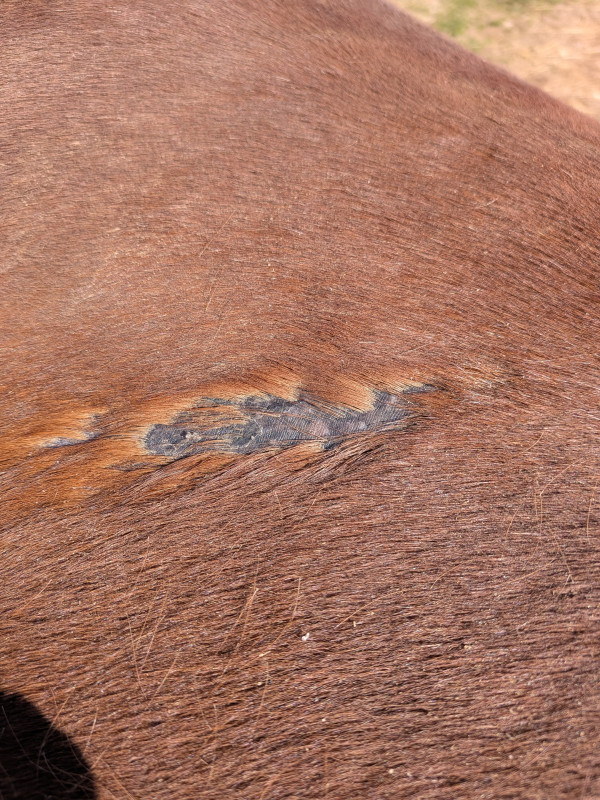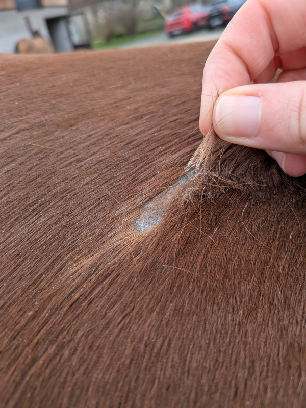 En brossant ma jument vendredi dernier je découvre une zone sans poils sur le dos , et qui s'agrandit au fur et a mesure des passages de brosse. Les poils partent un a un ou alors par petites touffes / croûtes.