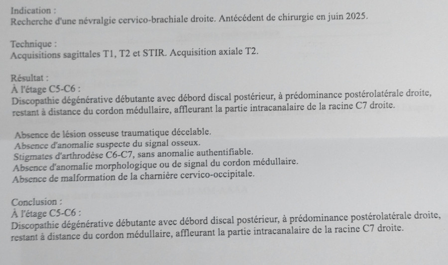 Opérée en juin 2025, arthrodèse C6-C7, enfin opérée et enfin crue après plus de 15 ans de souffrance, j'ai 35 ans au moment de l'opération, des années où on est sensé être jeune et en forme. Moi je pleurais de douleurs, ma nuque, mon dos, mes bras engourdis...